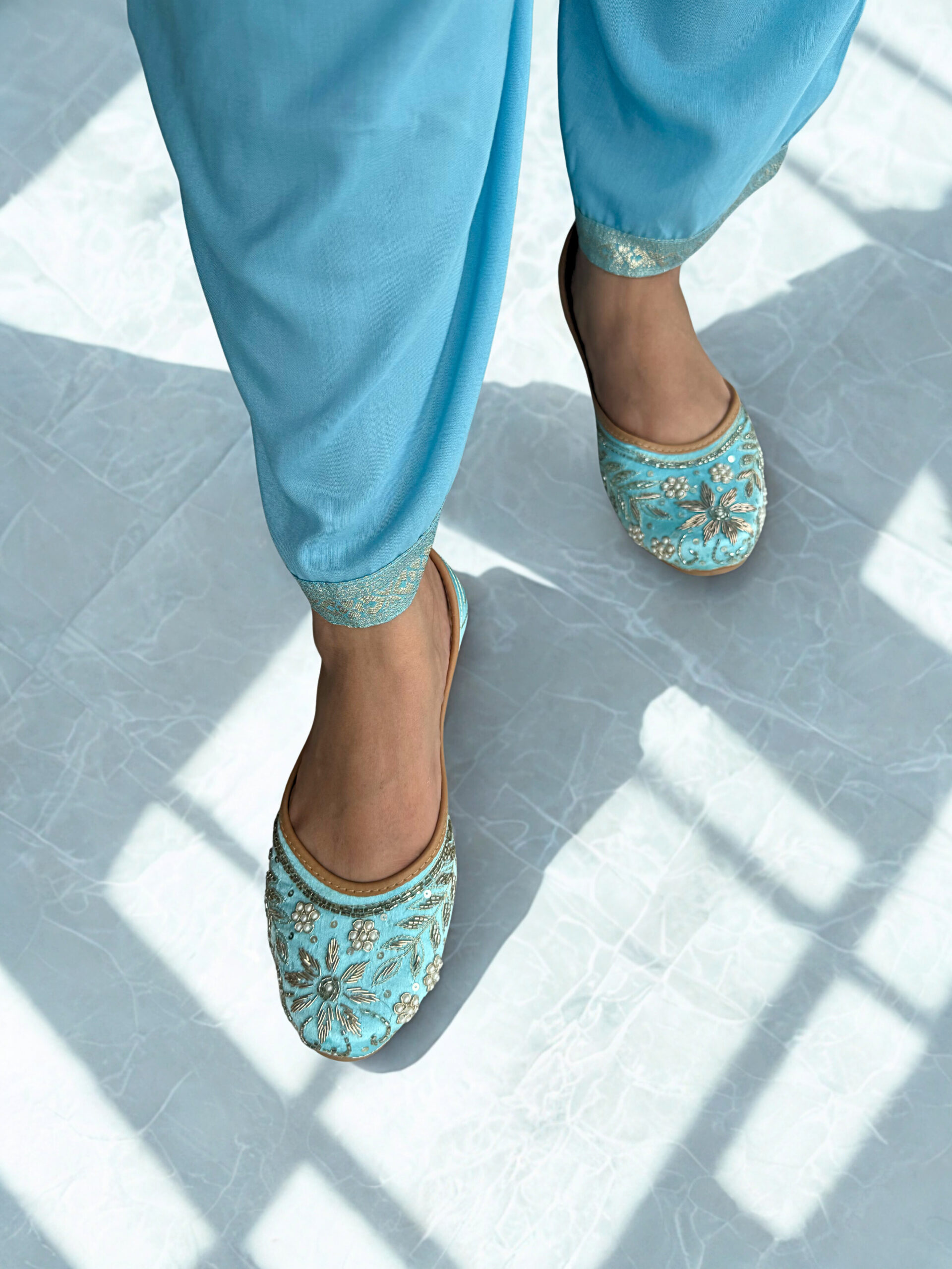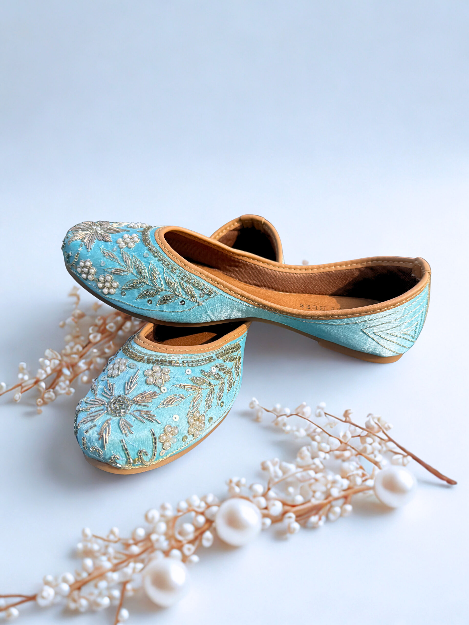 Cool as morning frost and delicate as dew, this icy blue velvet jutti is pure magic. Hand-embroidered with shimmering gold zardozi, pearly beads, and floral accents, it captures a wintery charm that’s both regal and refreshing. The soft pastel tone paired with intricate detailing makes it a dreamy pick for any occasion.
